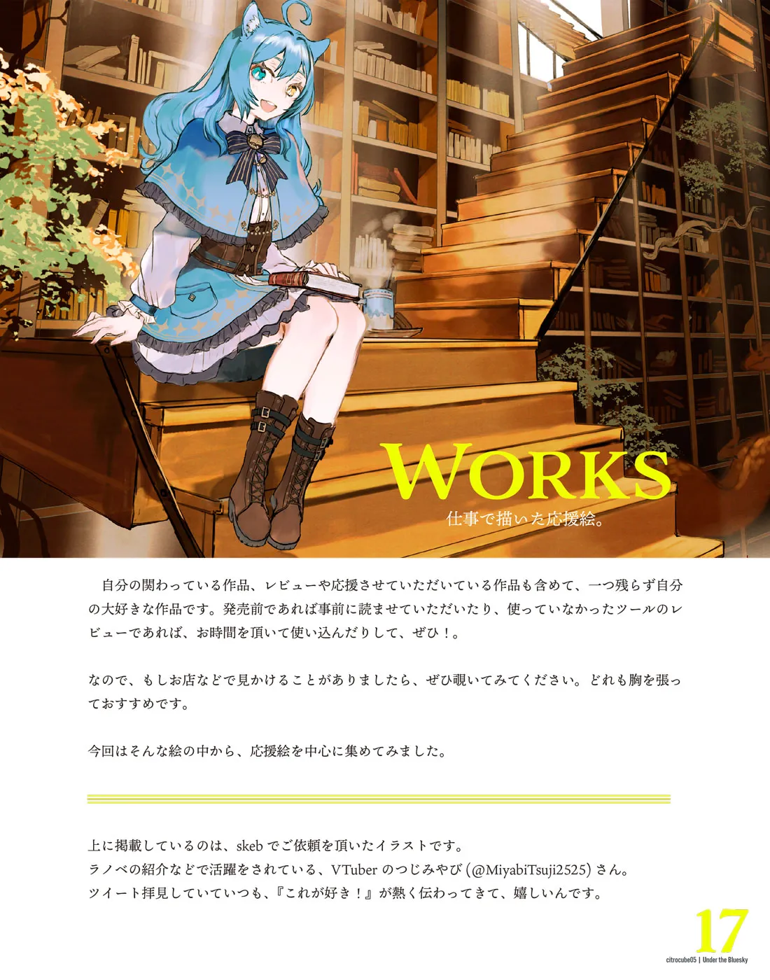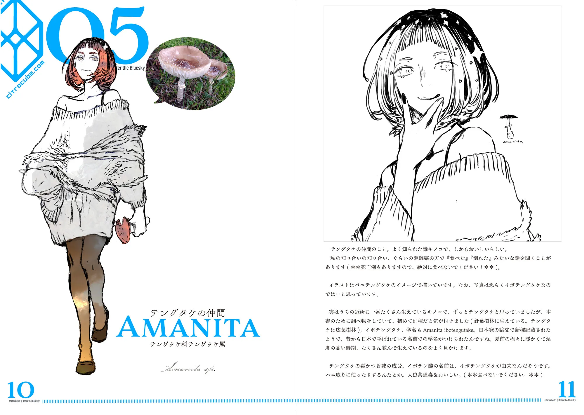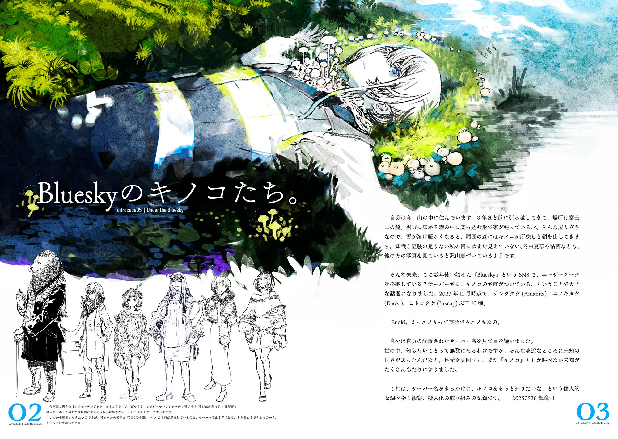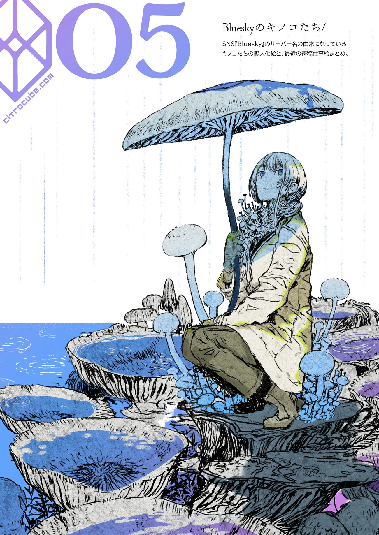 そんなところから好奇心。キノコの擬人化を少しづつ描き始め、コミティア合わせで発行したのがこの本です。キノコの擬人化6体(豆知識等いろいろ2万字程度のテキストも)+仕事やskebで描かせて頂いたイラスト4枚を収録。